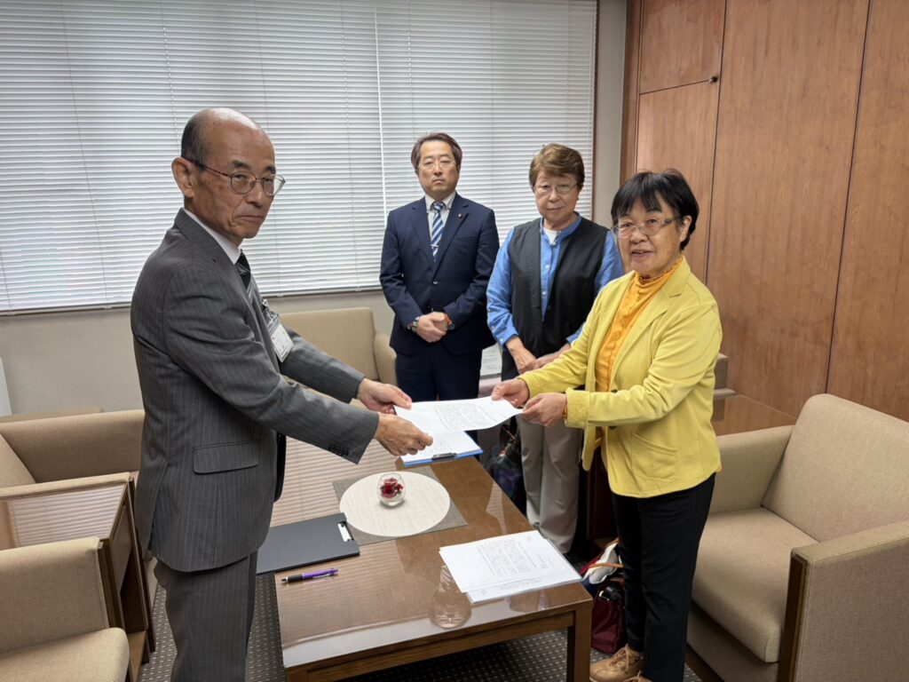 市長あて緊急要望書を副市長に手渡す日本共産党市議団