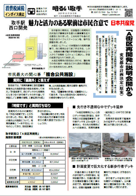 9月定例市議会で、日本共産党取手市議団は、開発・防災・まちづくり・くらし。産業振興を問いました。